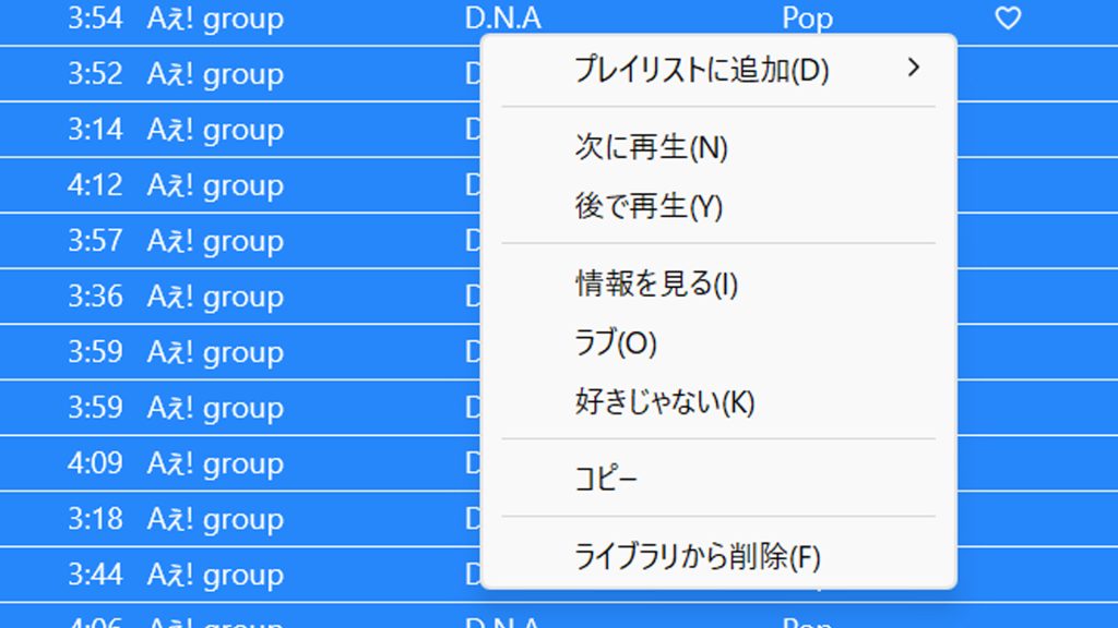 - iTunes内で曲をすべて選択して、右クリック→コピーする